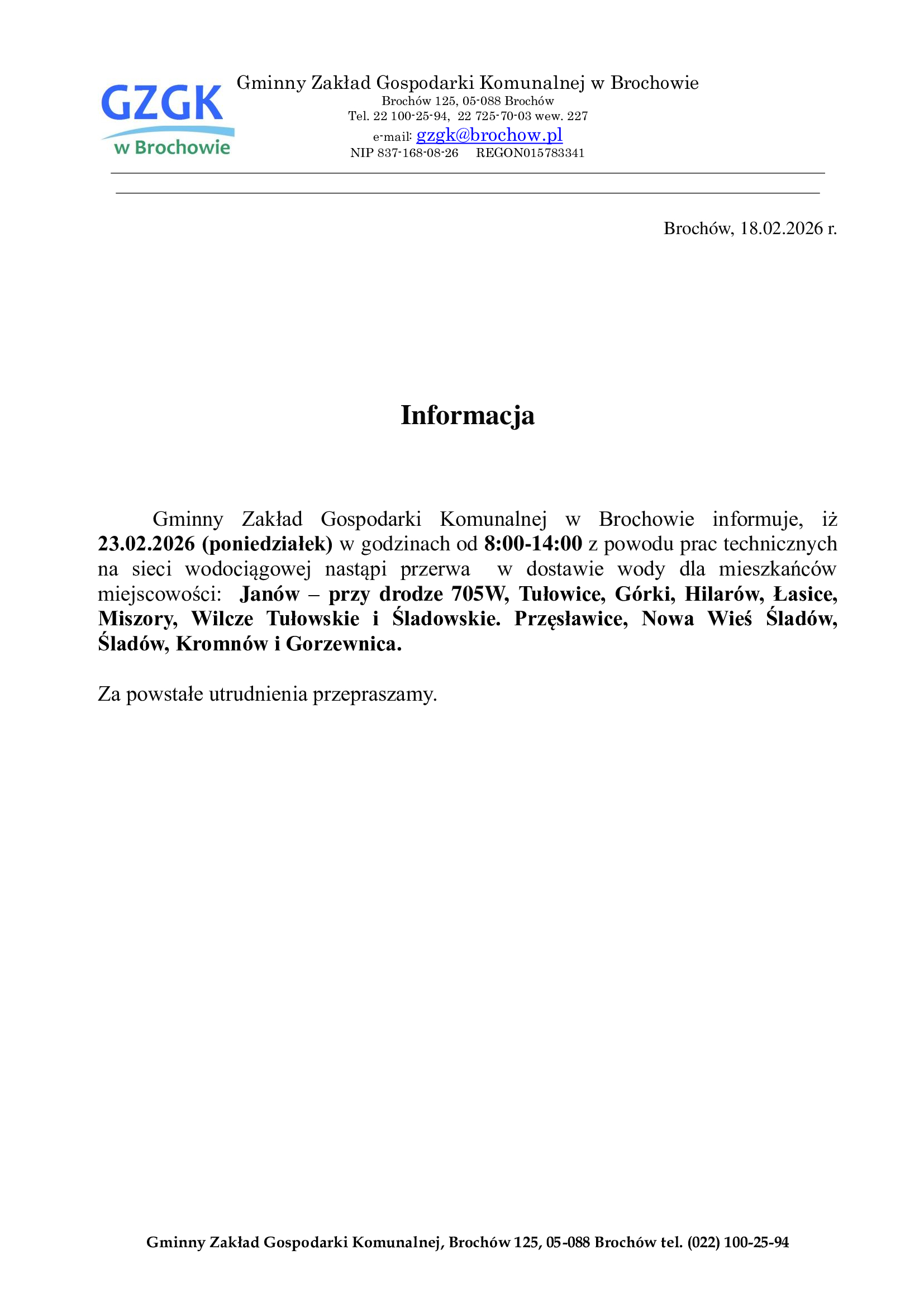 UWAGA! PRZERWA W DOSTAWIE WODY