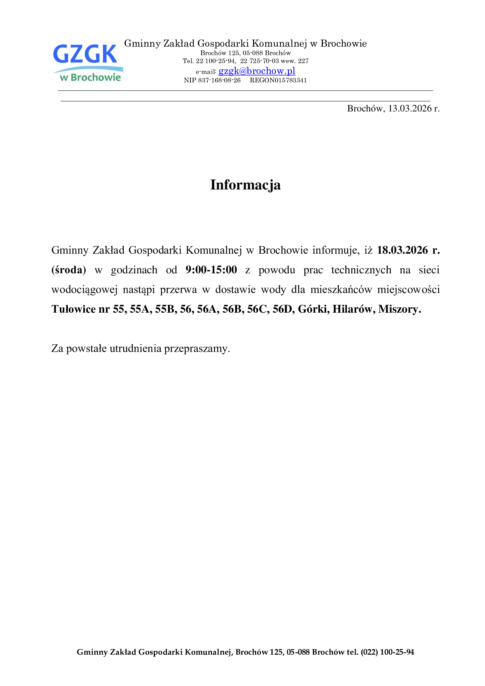 UWAGA! Przerwa w dostawie wody – Tułowice , Górki, Hilarów, Miszory